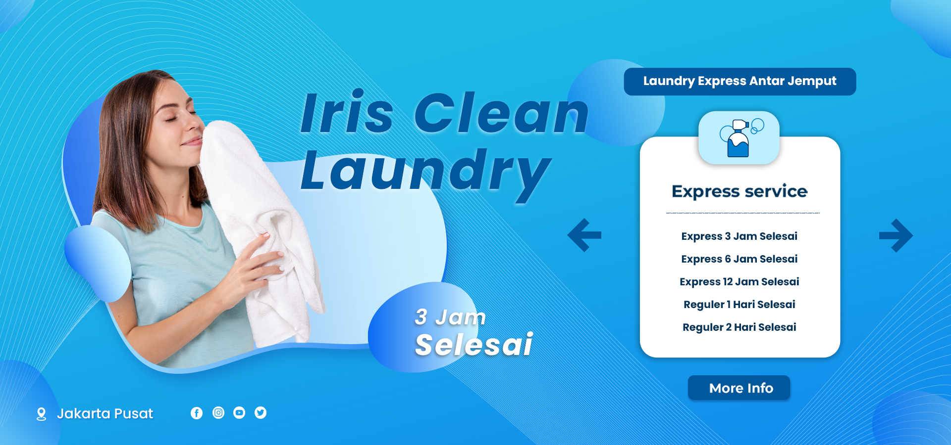 Iris Clean Laundry adalah layanan laundry profesional yang berkomitmen untuk memberikan hasil terbaik bagi pelanggan kami di Jakarta Pusat. Dengan pengalaman dan dedikasi tinggi dalam industri laundry, kami memahami betapa pentingnya pakaian dan perlengkapan rumah tangga yang bersih dan harum. Oleh karena itu, kami selalu menggunakan teknologi canggih dan bahan pembersih berkualitas untuk memastikan setiap item yang kami tangani mendapatkan perawatan terbaik. Dari pakaian sehari-hari hingga perlengkapan tidur, kami hadir untuk memberikan kebersihan maksimal dengan pelayanan yang ramah dan profesional.